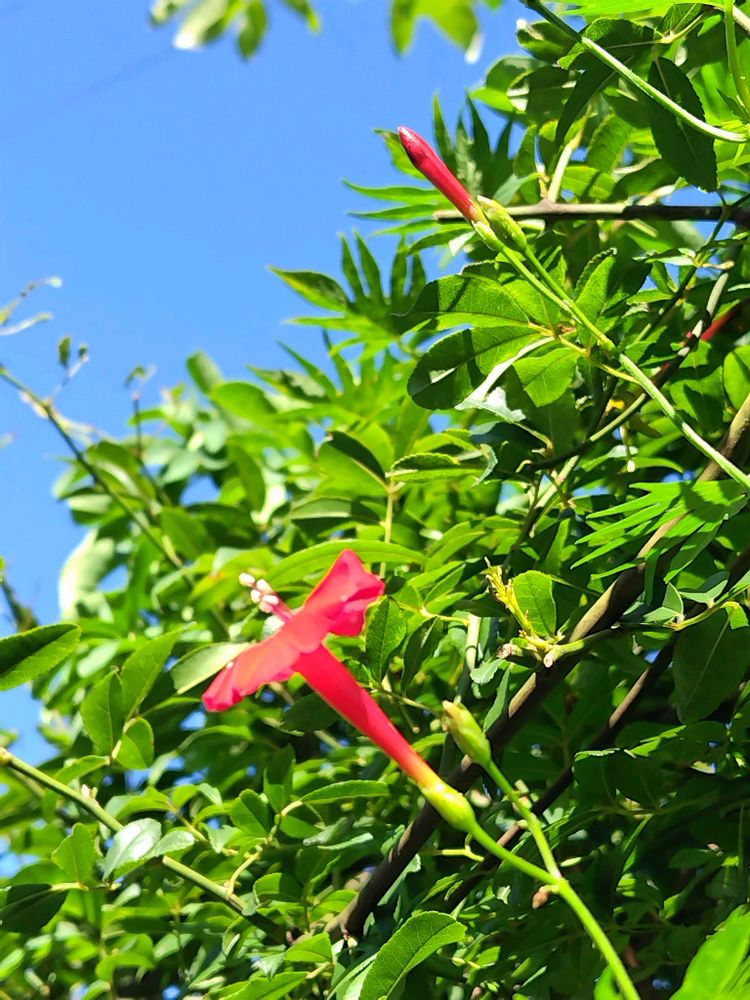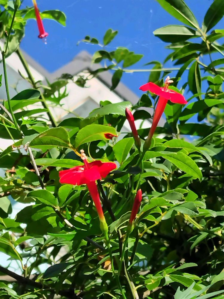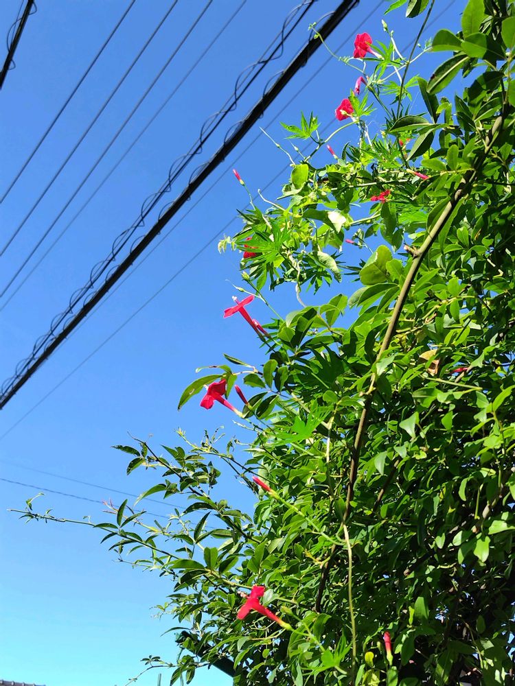 グリーンの葉っぱと真っ赤なお花が青空に良く映えます💙☘️❤️☘️💙