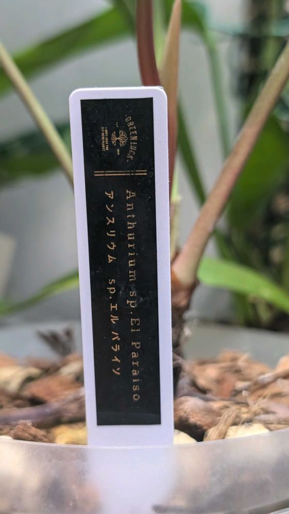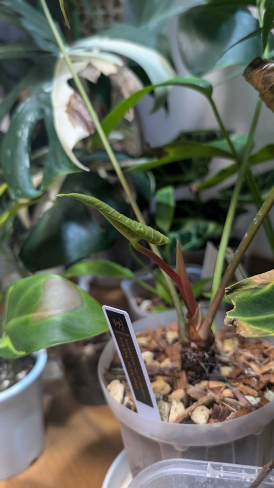 Anthurium sp. el paraiso aff. insigneの新芽が出てきました。前回は💪みたいなムキムキの耳してましたが今回はどうなんでしょうか.. 毎回葉の形状が違うせいでsp.やaff.がつくんだよ。