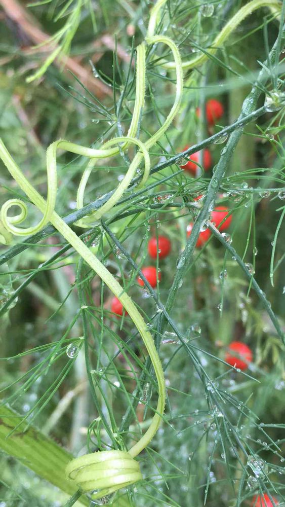 アスパラによく似た葉っぱの奥に可愛い赤い…実❓