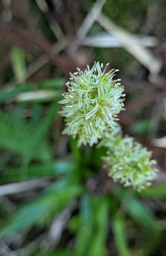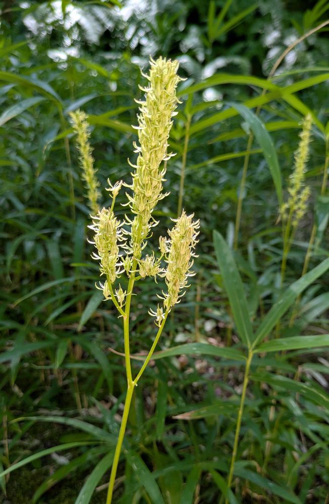 モサモサとした穂は小花の集まりで、透明感のあるうす緑色の花弁から6個の雄しべが突き出ている💚葯は熟すとオレンジ色になる🔶