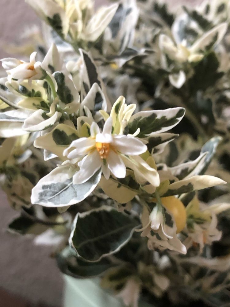 斑入りソラナム スノーサンゴの白い花🪸➡️丸い実がなりました➡️全体像です