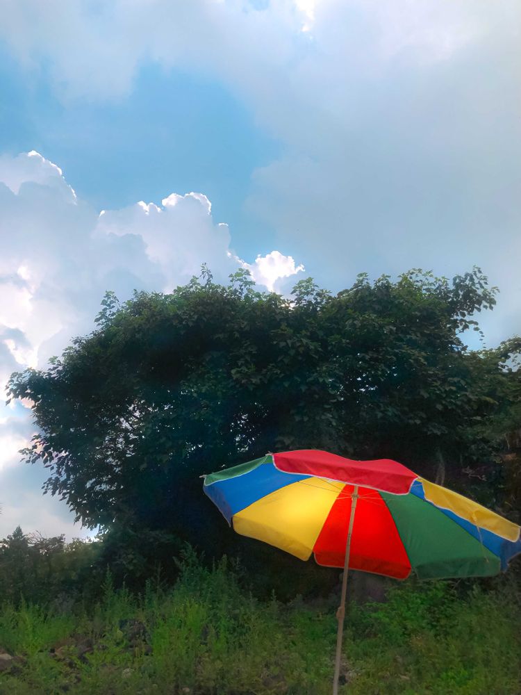 カラフルなパラソルが風に飛ばされ空に消えていったり