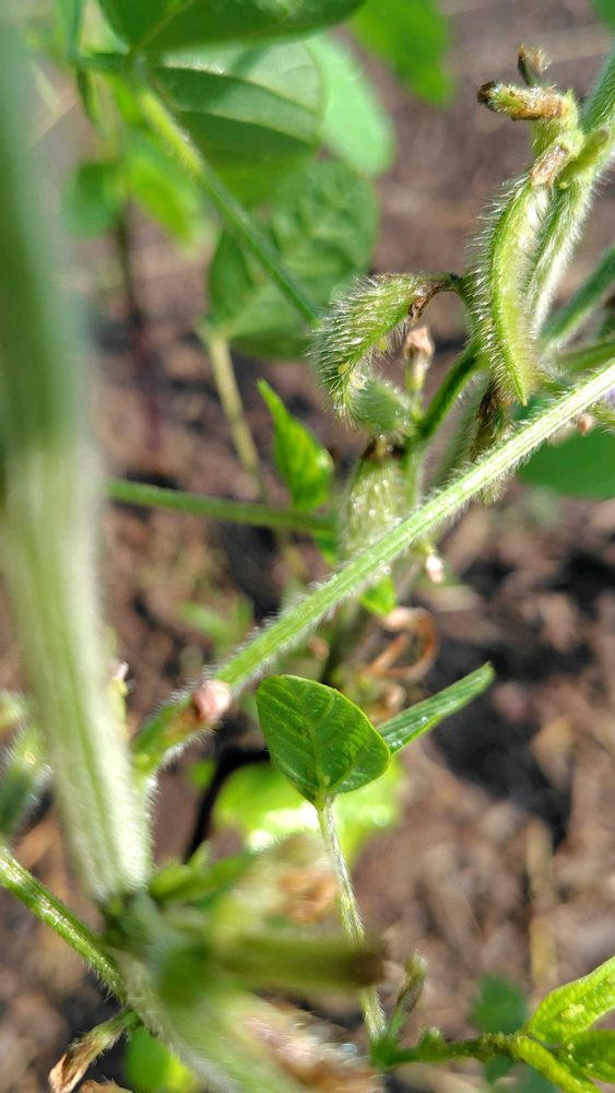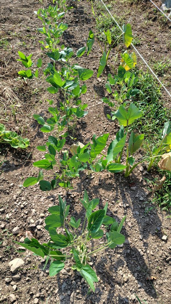 7/17に投稿した晩成白大豆の苗が畑で育っています。もう花が咲き、小さなサヤがついています。幼苗の時は虫がついて、育つか心配でしたが、葉水したり、木酢液したりしました、3日に1回くらいしか水まきに行けませんが、あっと言う間に紫色の可愛い花が咲き、サヤがついています。化学肥料はあげないので、ちゃんとした実になるかどうかはわかりませんが、この炎天下で枯れていない事にびっくりしています。