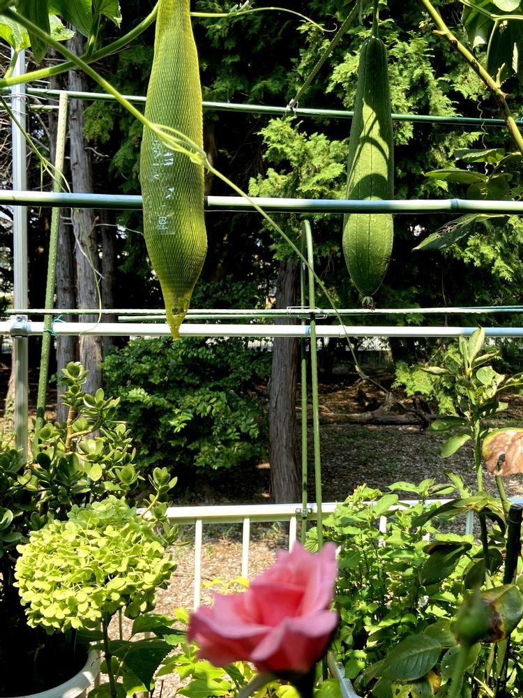⑤今年最後の緑色になったアナベルさんが隣で名残惜しく咲いてる💚😘 その後ろには旦那が種から育てたヘチマが2本ブ〜ラブラ🫨