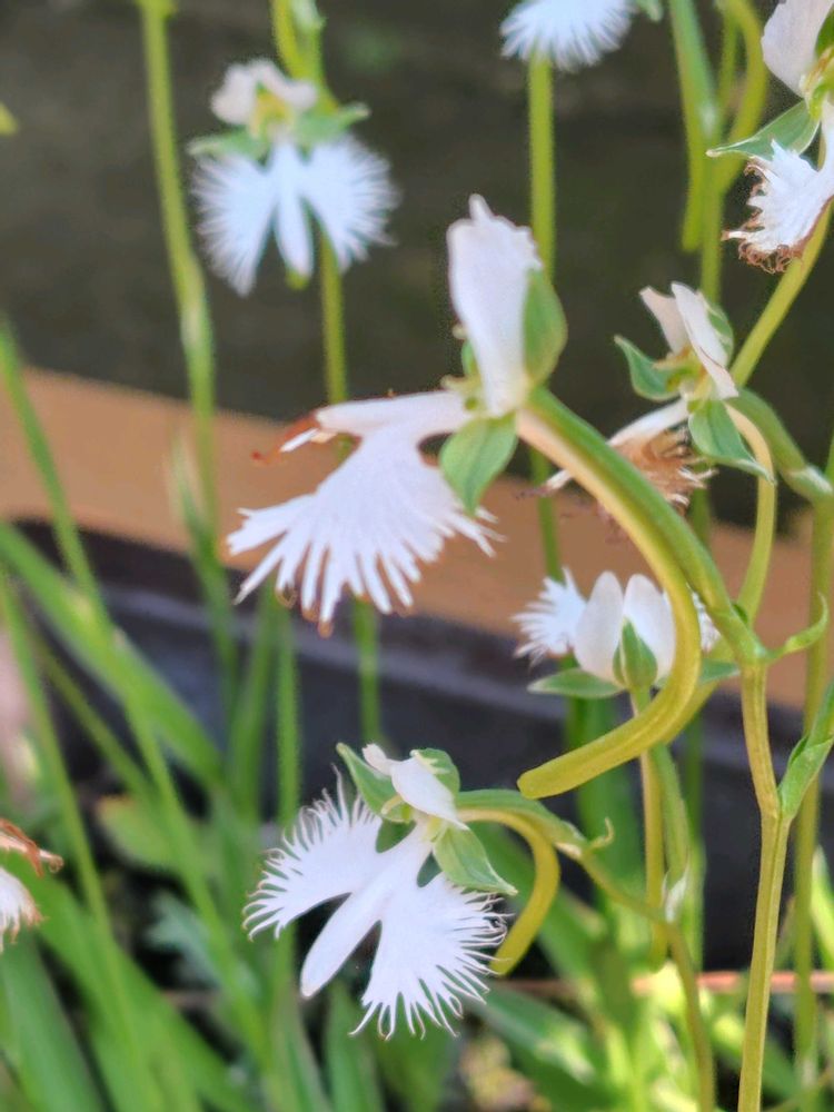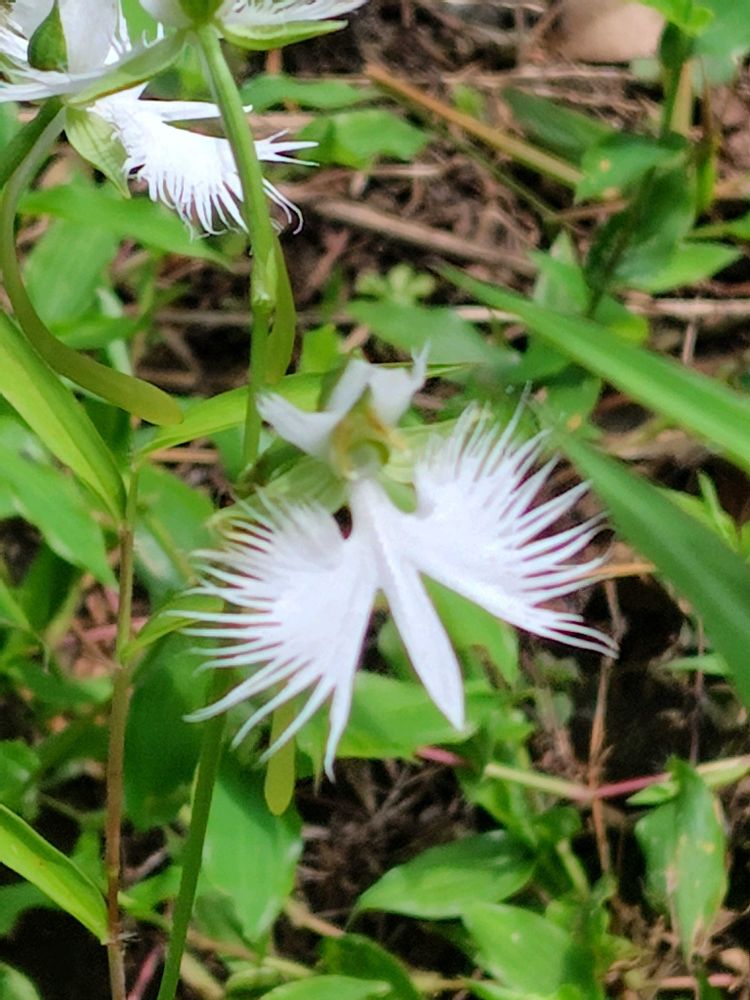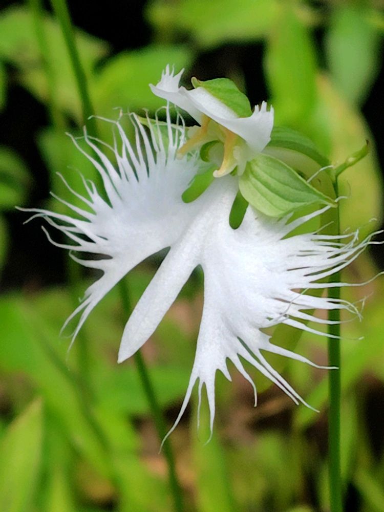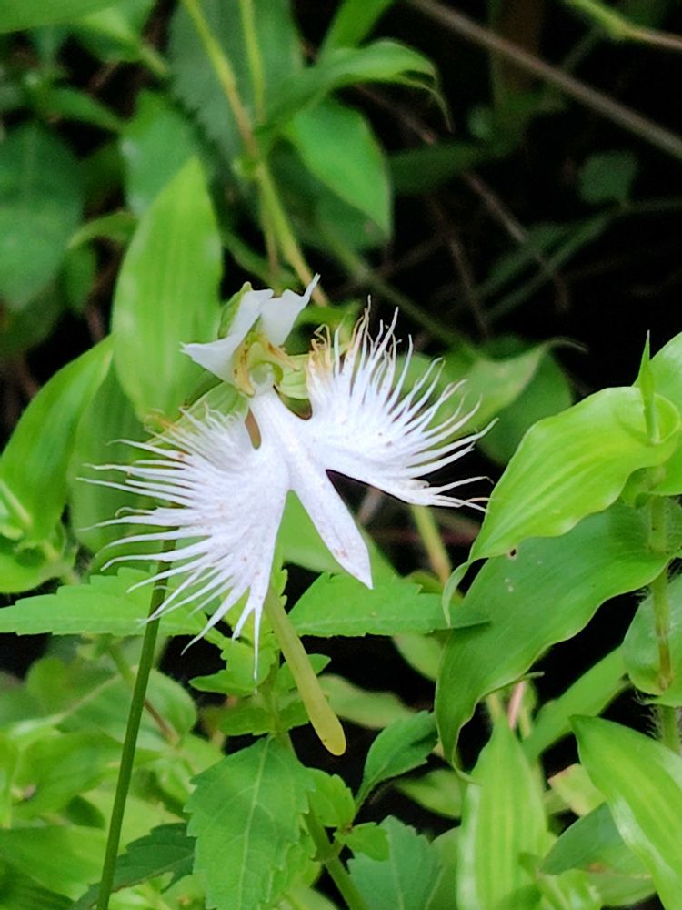 花は花径3cmほどの純白で、唇弁の先端が3つに割れ、その左右の裂片には多数の深い切れ込みがあって、その形は白鷺を思わせる。
