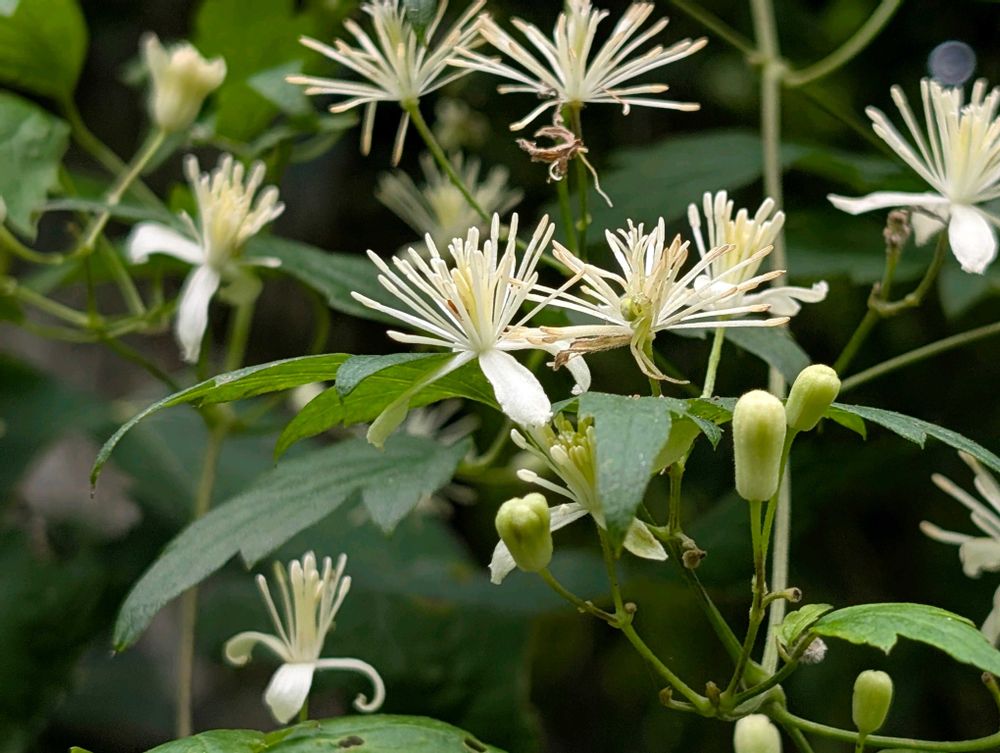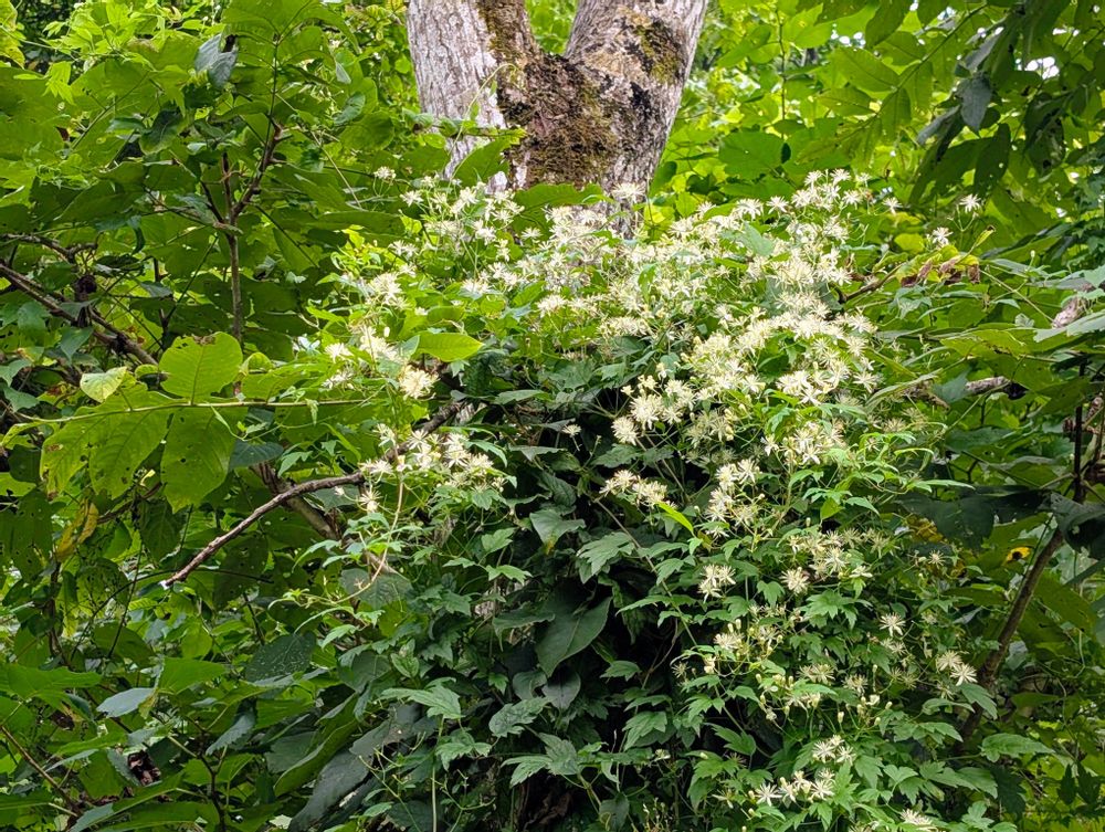 お疲れ様です🤗裏山斜面のオニグルミの木の根元に咲いていました😅センニンソウかと🤔❓ご指摘を頂きました。ボタンヅルのようです😅