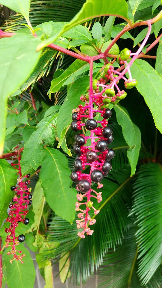相変わらずの毒々しい見た目は触れずに観察しておくだけにした方が良いでしょう…ヨウシュヤマゴボウは全草有毒なことが知られています。 葉・茎にはアルカロイドやサポニン、根には硝酸カリが含まれていて、食べると中毒を起こします。 ヤマゴボウの根は漢方の「商陸」という生薬になり、ヨウシュヤマゴボウの根にもある種の薬効があって、これらは使い方によっては毒にも薬にもなります。ヨウシュヤマゴボウ(西洋山ゴボウ)は、全草に毒を持つ植物です。触るだけでは人体に影響は少ないですが、果汁が皮膚に触れると皮膚炎を起こす可能性があります。また、誤って口にしてしまうと、嘔吐、下痢、腹痛を引き起こし、重症化すると痙攣や死に至ることもあります。特に、果実や根には毒性が強く、注意が必要です。