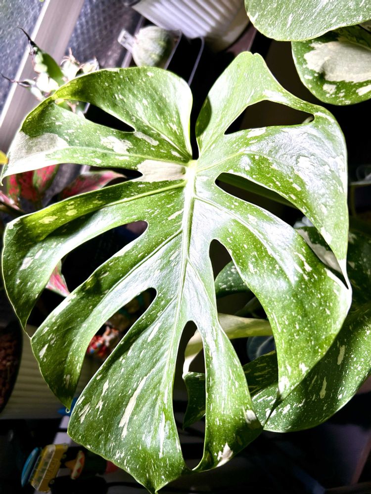 • 特徴:デリシオーサ(太い幹、大きな葉)の変異種で、純白の斑が入ります。
