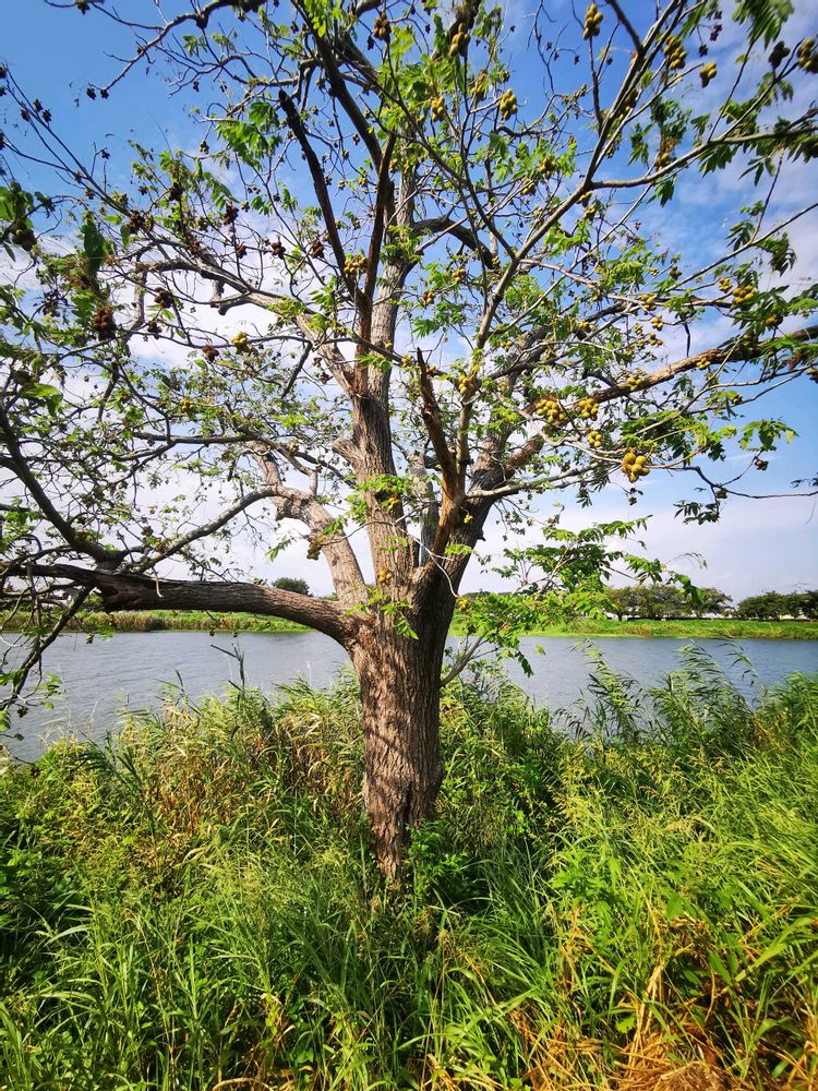 オニグルミの木の葉が虫に食われ、実が目立ちます。
