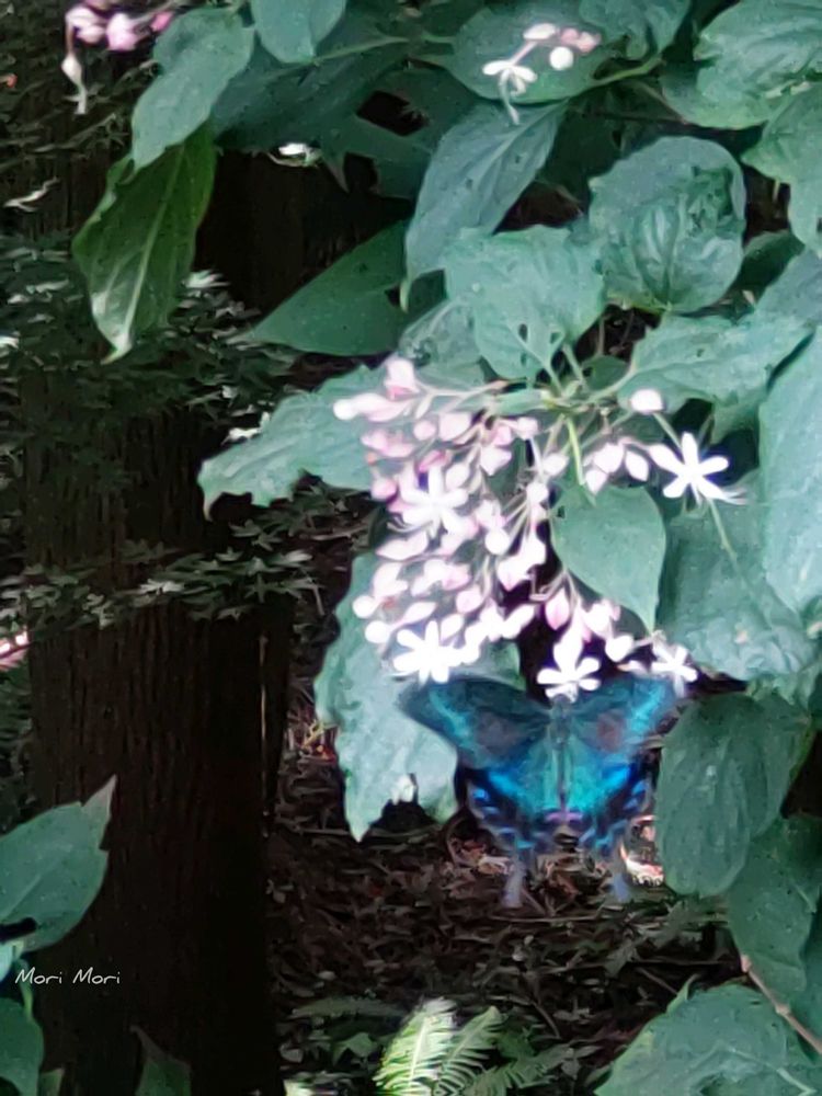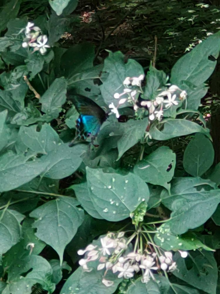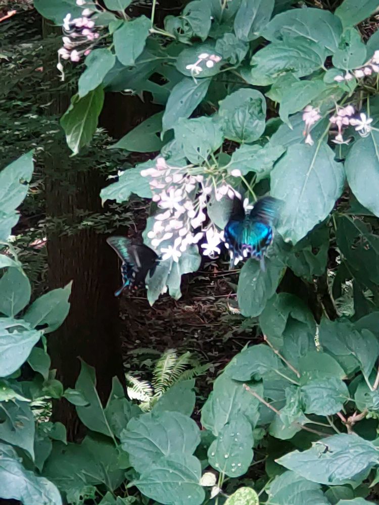 カラスアゲハでしょうか? 背がコバルトブルーのとても綺麗な蝶がクサギの花に沢山吸蜜に来ていました🦋🦋🦋