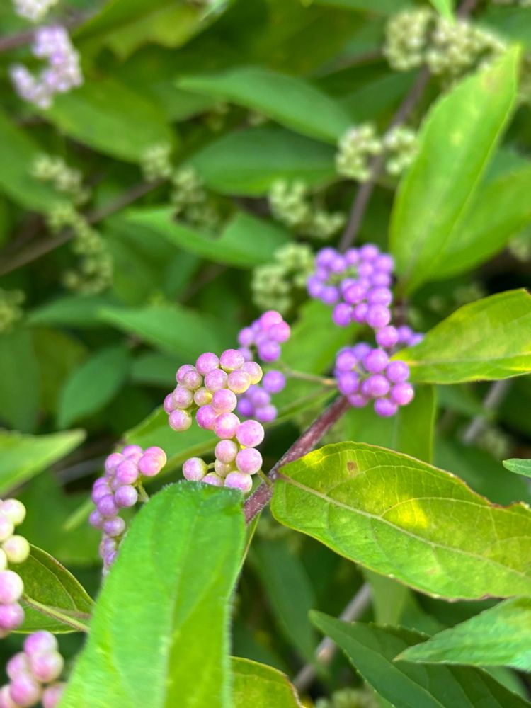 春先に投稿した小紫(コムラサキ)の花が実って、かわいらしく色付いてきました。朝日を受けてキラキラ✨