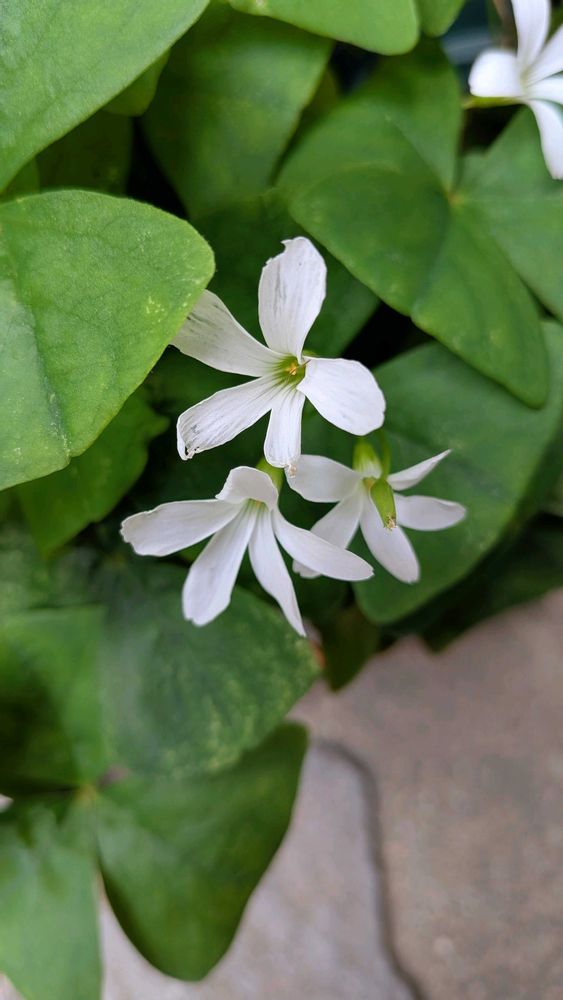 三角の葉っぱオキザリスの白い花です。