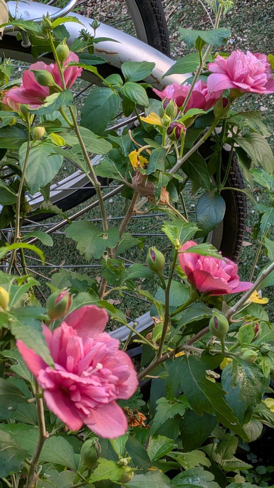 八重咲きムクゲの花が一度に5つ開花咲しててます。