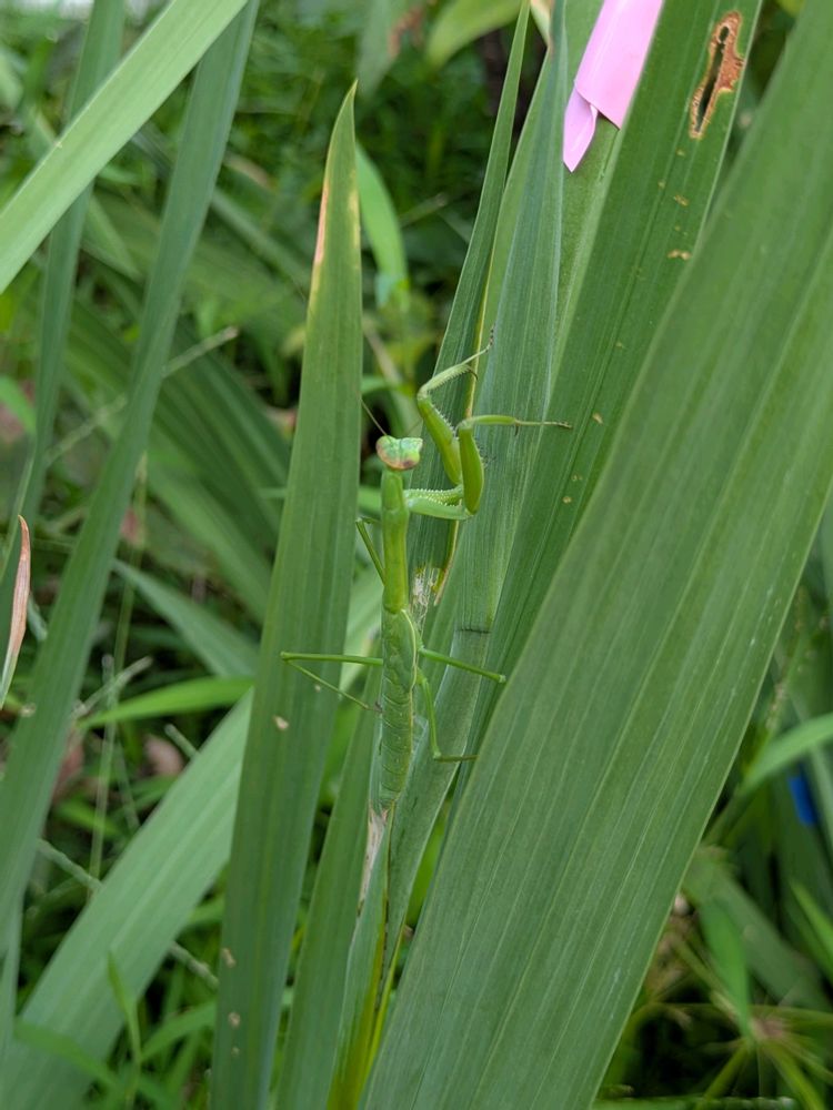 グラジオラス、中央のラインがスッキリしています。カマキリは、なるほど葉に擬態しているのね。来た虫を捕らえなきゃ生きてはいけないもの。