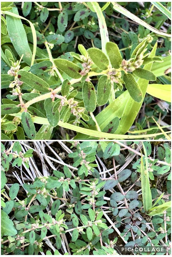 きつい直射日光でカラカラに乾いた空き地に広がっているのはトウダイグサ科ニシキソウ属(トウダイグサ属とされることも)ですけど、地面を這うのはハイニシキソウ、コニシキソウ、アレチニシキソウ等々色々ありますが、葉の斑紋や茎の毛の有無から、ニシキソウでいいのだはないかと思います🤔