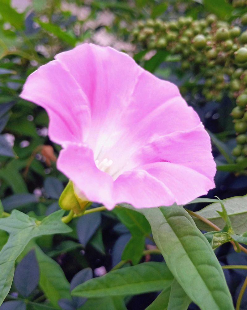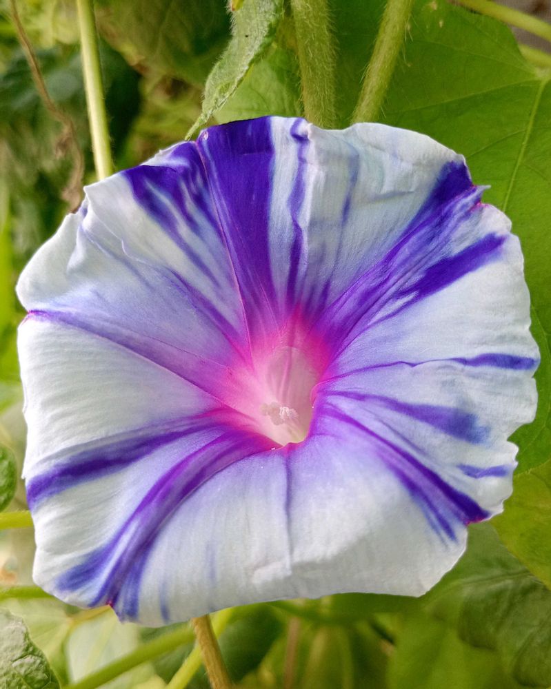 🤍ジプシーブライダル、💙💜裂咲き、ツルが絡まり🏷️と一致せず😂😗達…と、🐦️の落とし物🤔❓ 南天の気に1輪のヒルガオ🩷🌿が…🤭 ビックリ、でもほっこり🍀朝の水やり🚿😴の目が覚めた瞬間でした。