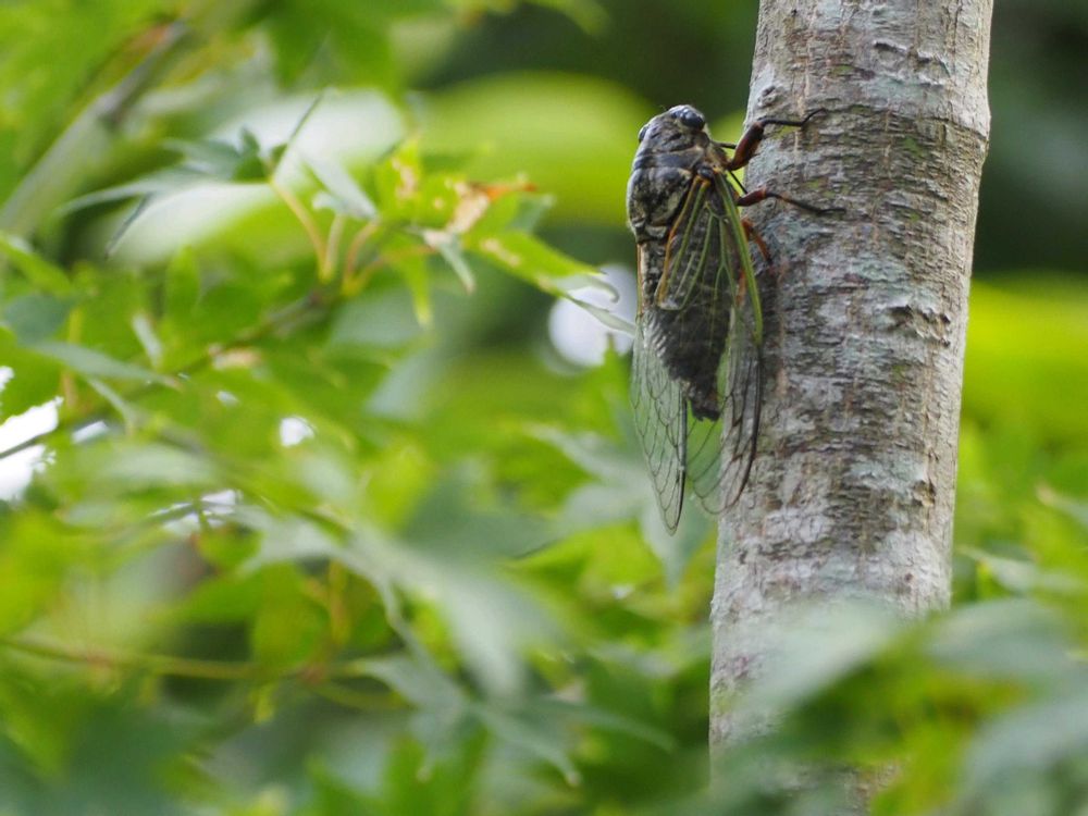 イチヂクの枝とモミジの幹で 鳴いていますワシワシ♪♪♪(^^)