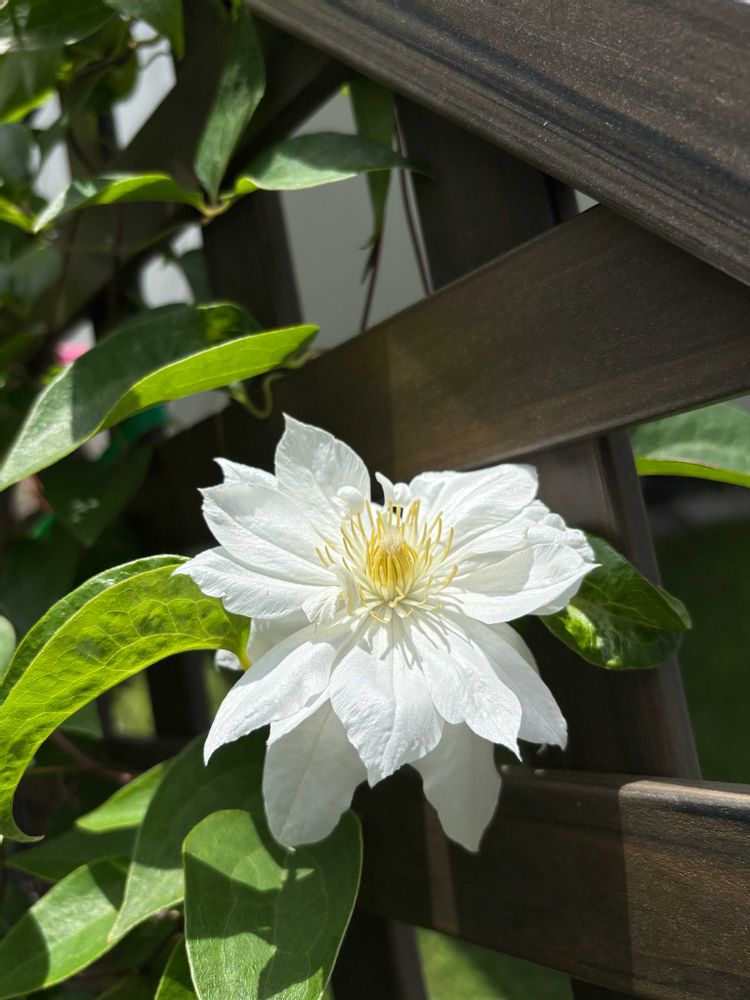 クレマチス、太陽がお隣さんの方が陽が入るのでそちらに向かって咲いていました😂
