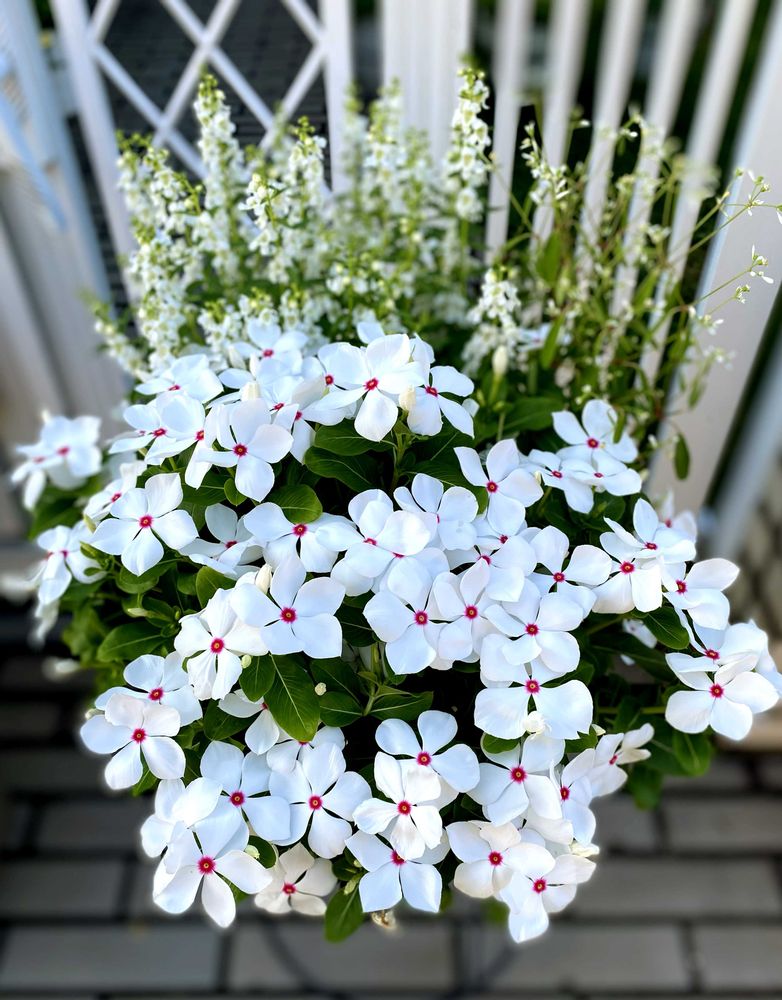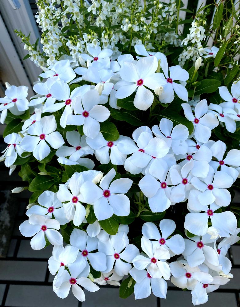 98円ニチニチソウ1株、3回目の満開❣️アンゲロニアは2回目❣️暑さが好きなこの子たちは、今年は切っても切ってもおもしろいほど咲いてくる🤣