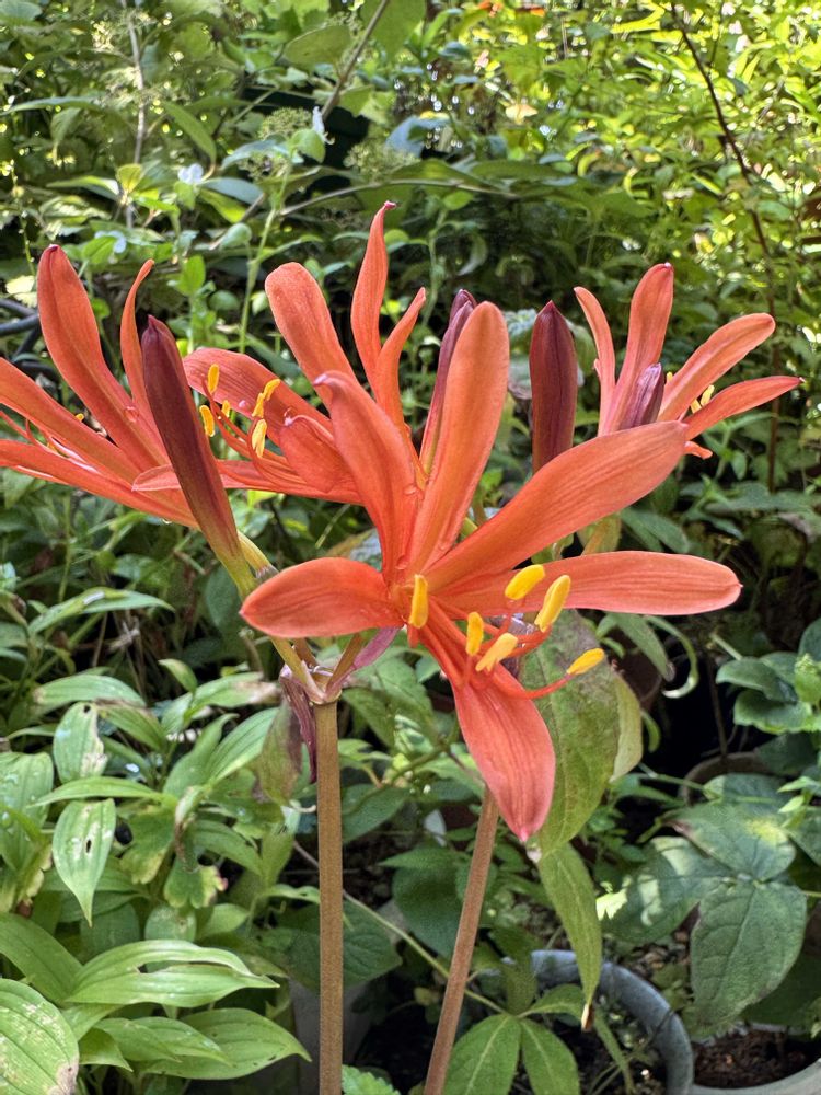 8月なかば)前後になると花茎を 30〜50cmほど伸ばし、先端で枝分かれした先にいくつかの花を咲かせる。雌雄同花で花弁は橙色が6枚。