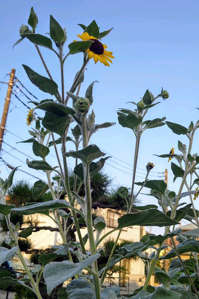 最後を飾るヒマワリ、銀緑色の葉が美しいね。