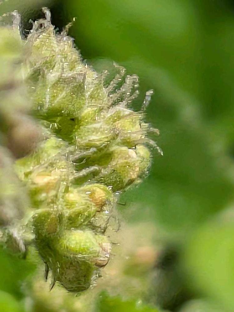 雌花は閉じたまま花被片の隙間から花柱を外に伸ばす。ヒョロヒョロ見えるのが花柱と思います。