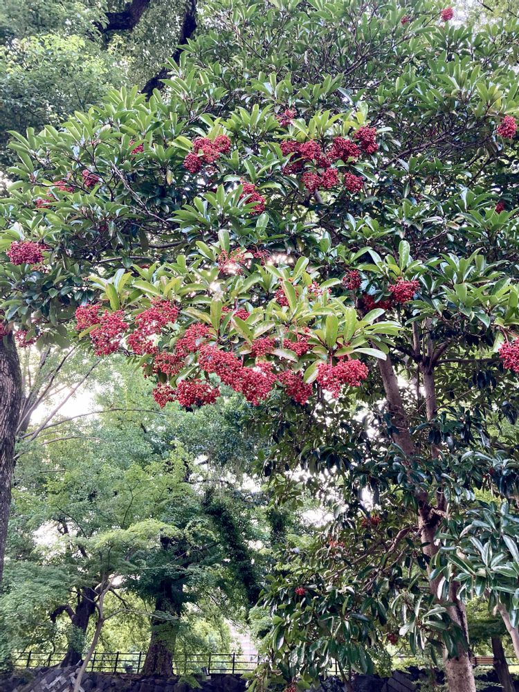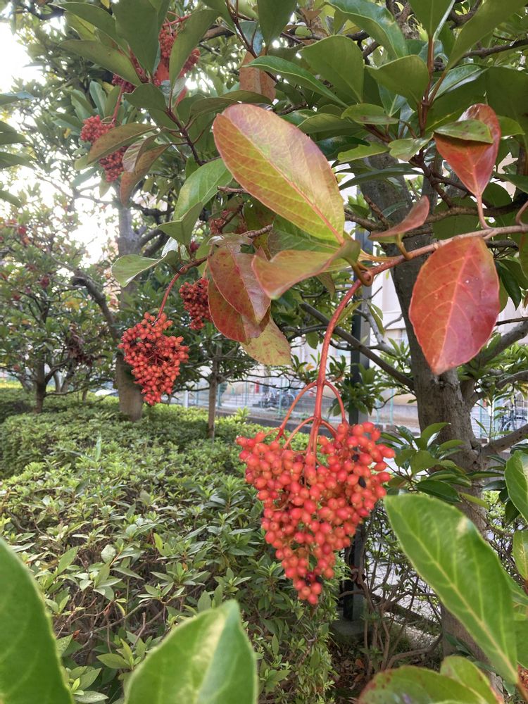 東京ミッドタウン日比谷の真向かいの日比谷公園の「サンゴジュ」の木が、歩道沿いで真っ赤な実をたくさん付けている。