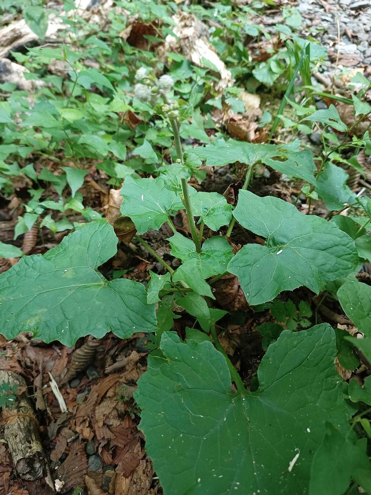 葉は長さ10~20㎝の三角状腎形、先がやや尖り、基部は心形。葉柄は長さ10~20㎝、狭い翼がある。葉の裏には白色の綿毛が密生する。頭花は白く、両性花が多数固まってつき、周囲に雌花がつく。雌花には腺体がある。結実しない両性花が落ちた後に、雌花の果実だけ放射状形に残り、先端部分の柄の太い腺毛が目立つようになる。痩果は熟すと黒くなり、長さ6~7㎜の先の太い棍棒状、腺毛があり衣服に付着する