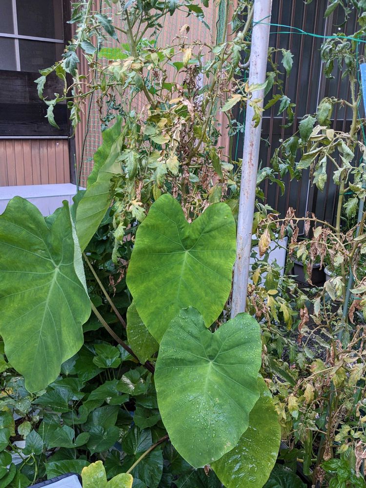 土嚢袋栽培で去年の根っこから出てきたと思われる里芋と勝手に生えてきたトマト