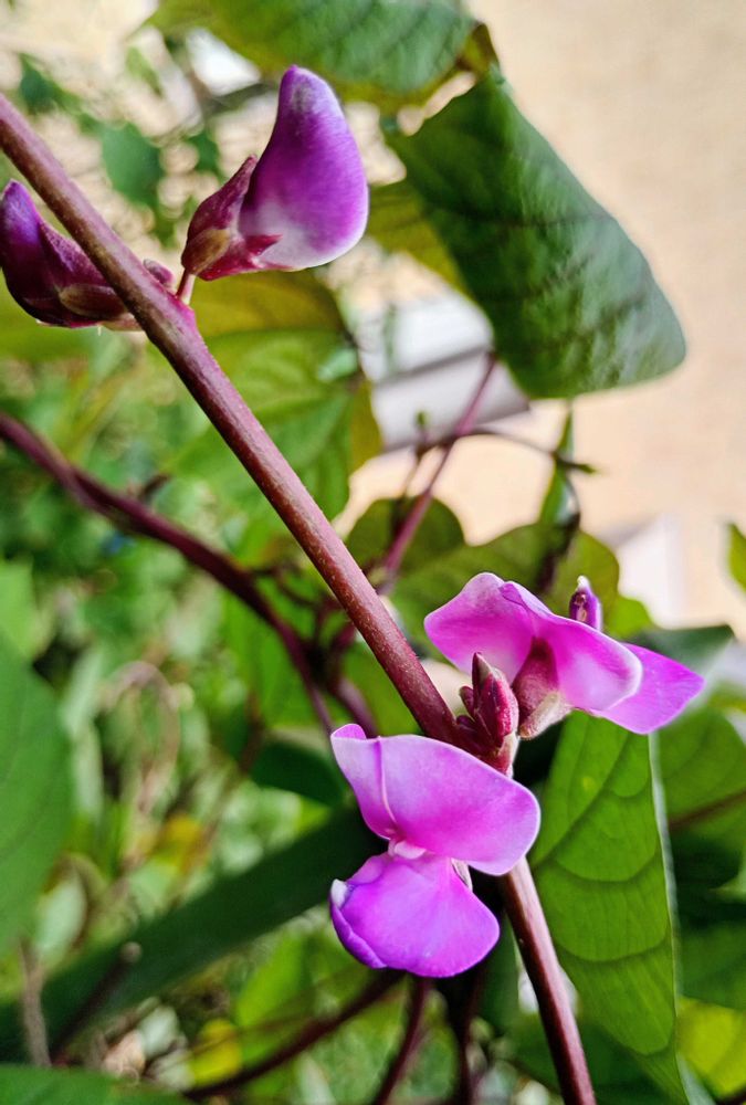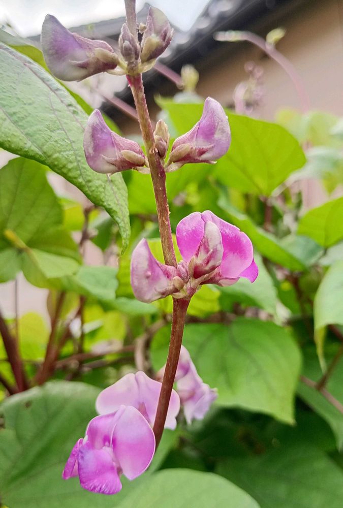 種は春にまき、夏にピンクの花🩷💮が咲いた後、深い紫色の豆💜ができます。ツル性でとても生長力が強く、地植えにすると5m以上伸びるため、夏場のグリーンカーテンとして利用できます。深い紫色のさやの状態は、切り花としても流通しています。