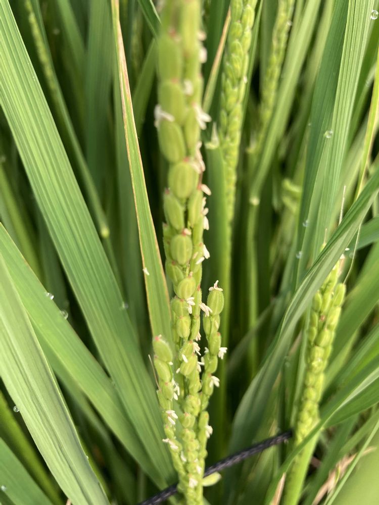 西隣り田圃のもち米に花が咲き始め、葉で休憩するショウリョウバッタ、東隣り田圃のミルキープリンセスの稲穂。