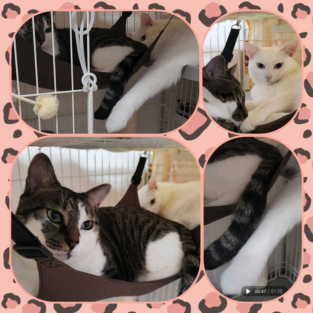 白猫せんちゃんがかまって欲しそうにキジシロばんくんのしっぽにしっぽでチョンチョンしてるところです☺️