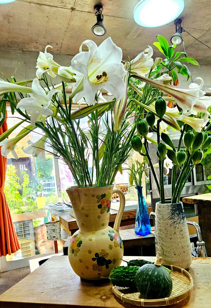 1️⃣高砂百合は直ぐに捨てます一応写真を撮ってから😌‥新テッポウ百合、ウバユリ蕾、掌サイズのカボチャとゴーヤ🤗