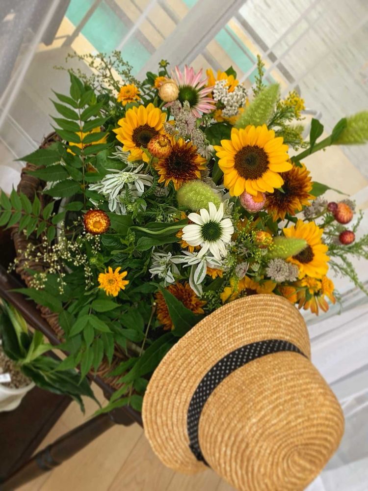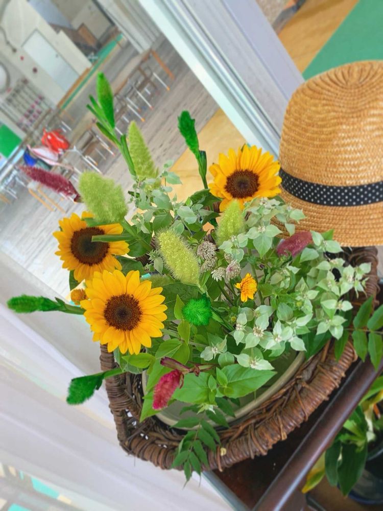 7月の生け込み 今月のテーマは かご編みと麦わら帽子 ヒマワリを主体とした夏らしい作品に統一してみました。