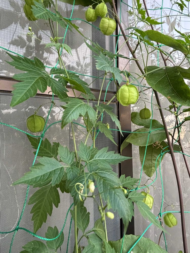 今年の緑のカーテンはアラカルト❤(◕‿◕✿)グロリオサ、パッションフルーツ、零れ種の風船カズラと朝顔が自由気ままに網をつたっています