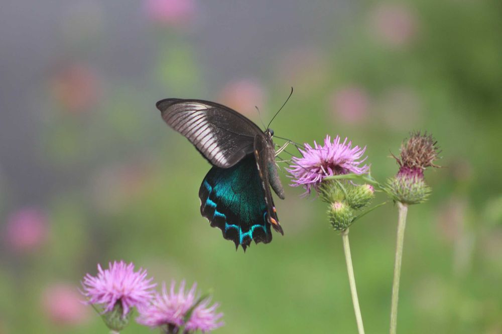 緑の背景にアザミのピンクと青い翅がいいなぁって思いました😊