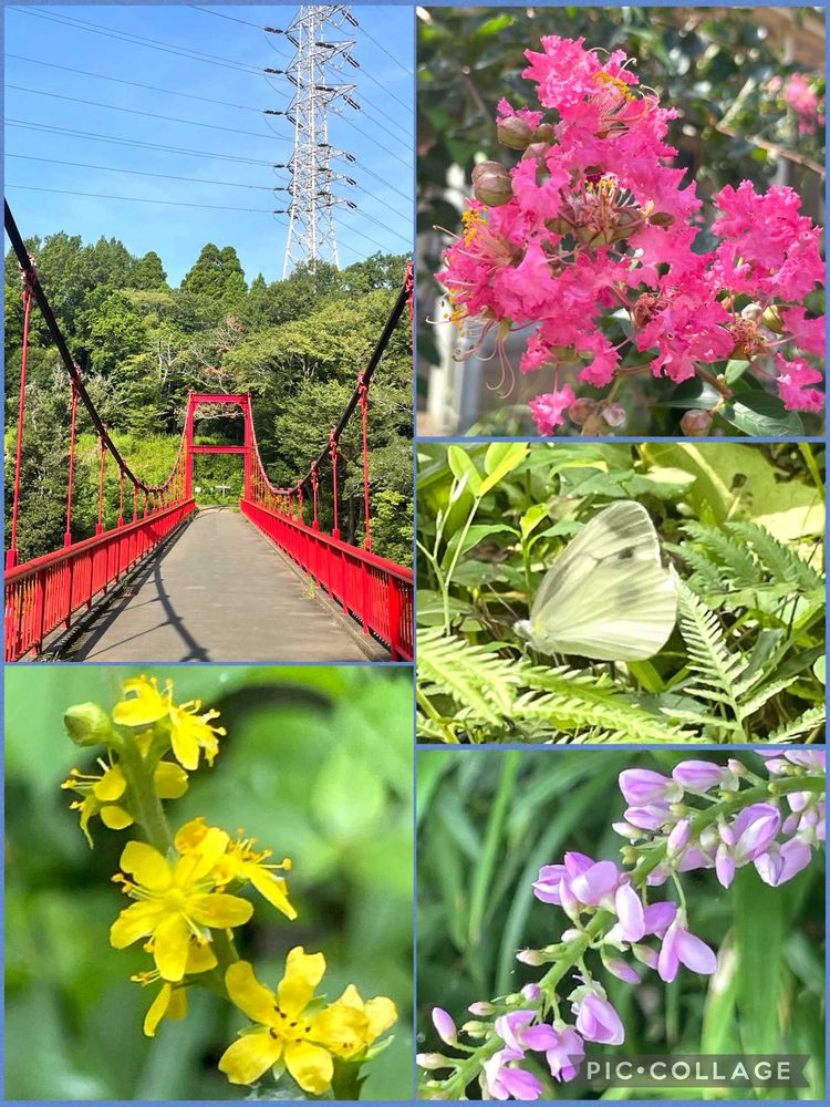 赤い吊り橋や自然の花たち