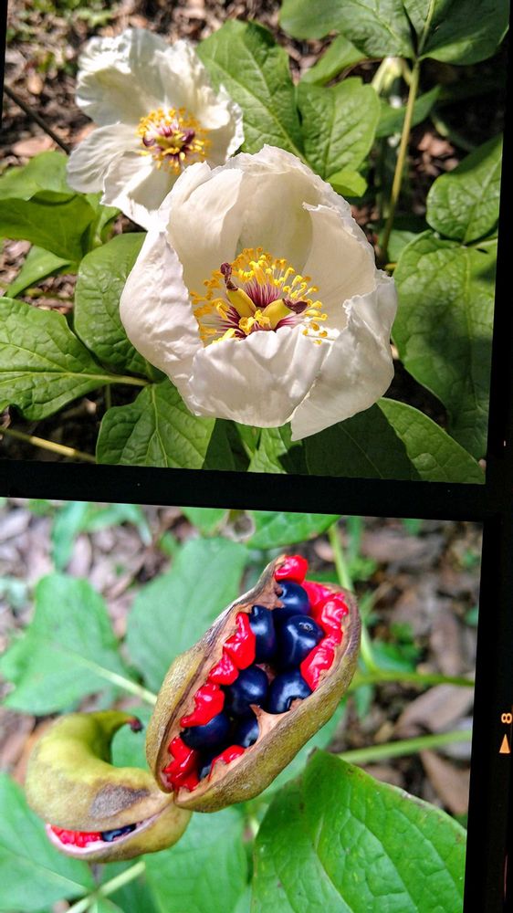 ② ホトトギスの隣では、4月に咲いた山芍薬の花後の鞘が裂けて、赤と黒の実が顔を出しています❤️🖤