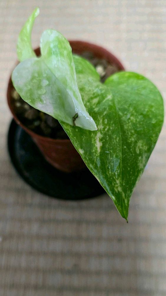 2025.8月に某サイトで購入した【アロカシア チャイ】の 突然変異?なんだろう 購入時、元々有った葉を(1枚目の葉)として、 下から新たな葉が出てきてる状態で到着しました(2枚目の葉) こちらに来て初めて出てきた葉に異変が。。 育て始めて出てきた初めての3枚目、4枚目 (途中から、斑1、斑2、、と続きます) どこまでこの謎の斑入葉が続くのか、 いや止まるのか……記録していきます