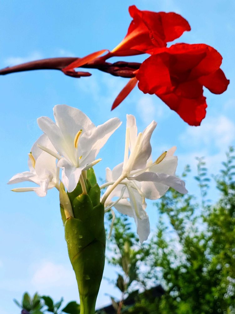 ジンジャー(ハナシュクシャ)&カンナ オーストラリア咲きました。紅白ヒラヒラでどちらも伸びて葉っぱもおっきくてよく似てます。