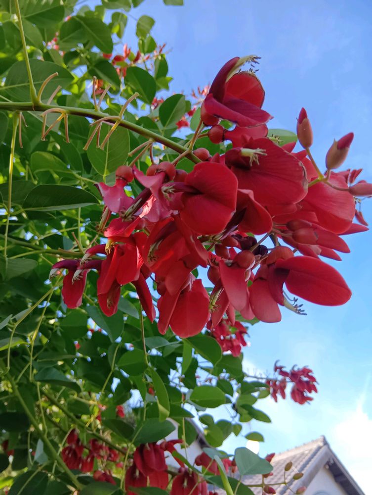こんなに暑いのに、燃えるような赤い花が青空に映えて、暑さは感じなくなります😅