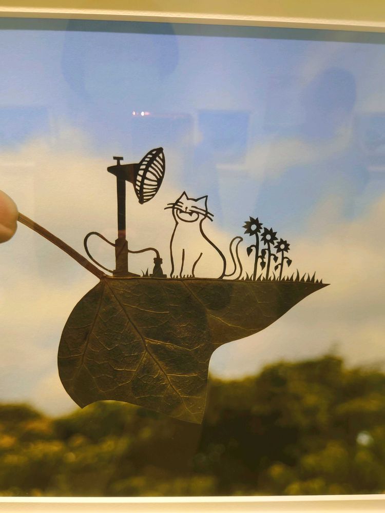 4️⃣リトさん葉っぱアート🐱タイトル「にゃあ~~~~~」扇風機で涼んでるニャン🐈🎐𓂃𓈒𓂂