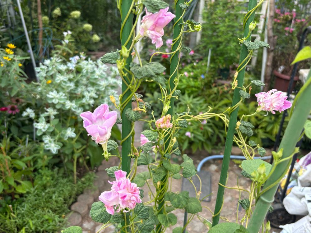 今年は、古い朝顔の種を撒いてみたので、去年とは違った色合いの出て来てる。