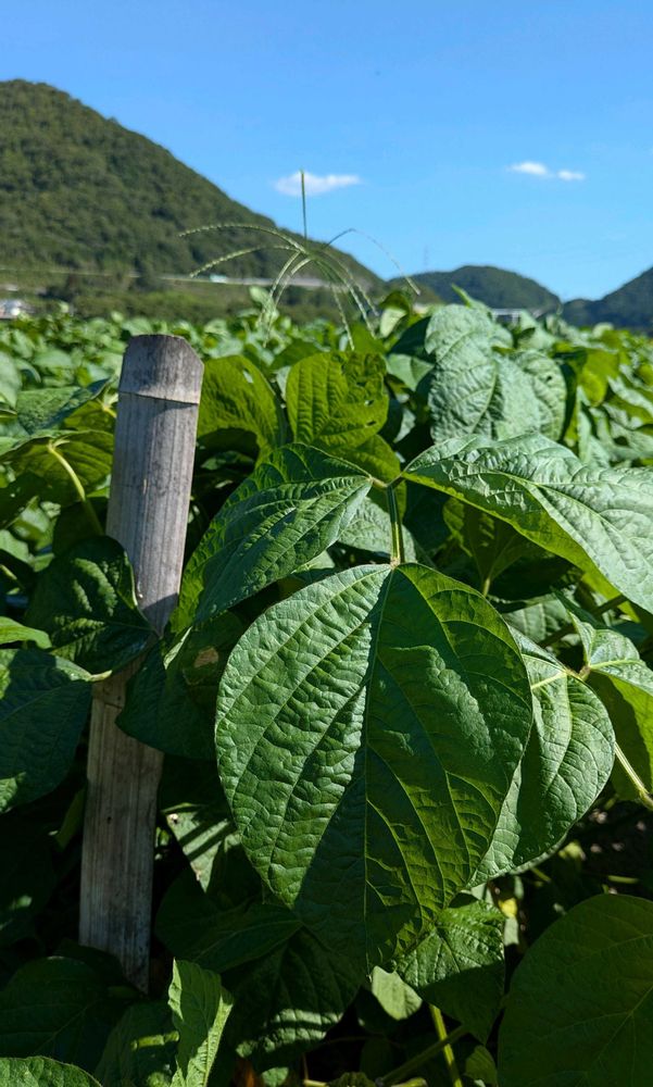 去年は大凶作(;>_<;) 今年も7月は少雨どころか、ほぼ1ヶ月雨が降らずに心配していましたが、営農組合の畑でもなんとか育っていて嬉しい♬ 竹の棒は、株が倒れないようにするための支柱です🟫