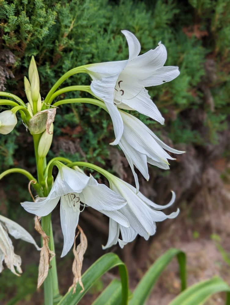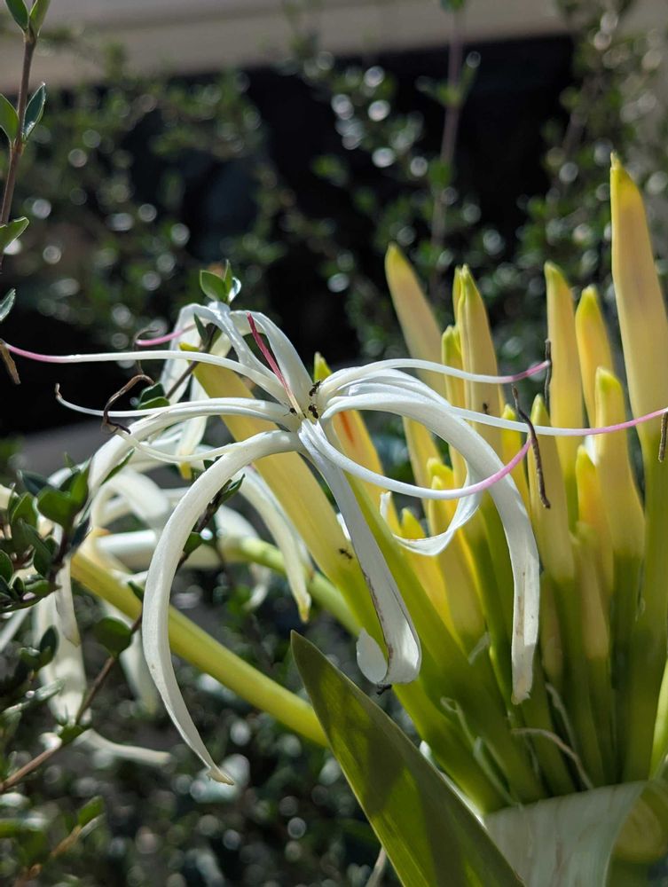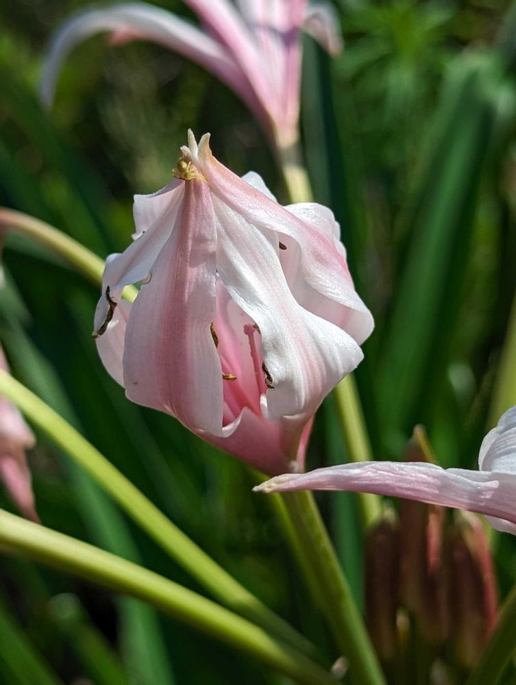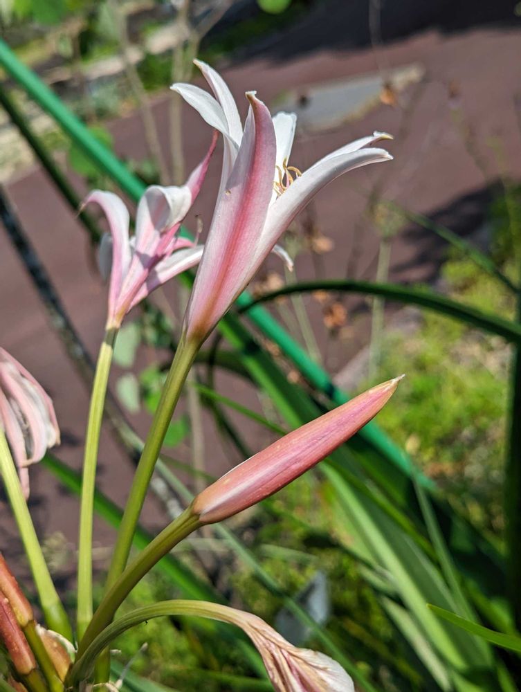 ③昨年6月に植物園にて撮影のアフリカハマユウのお花。白い花弁にピンク色の筋が入っています。