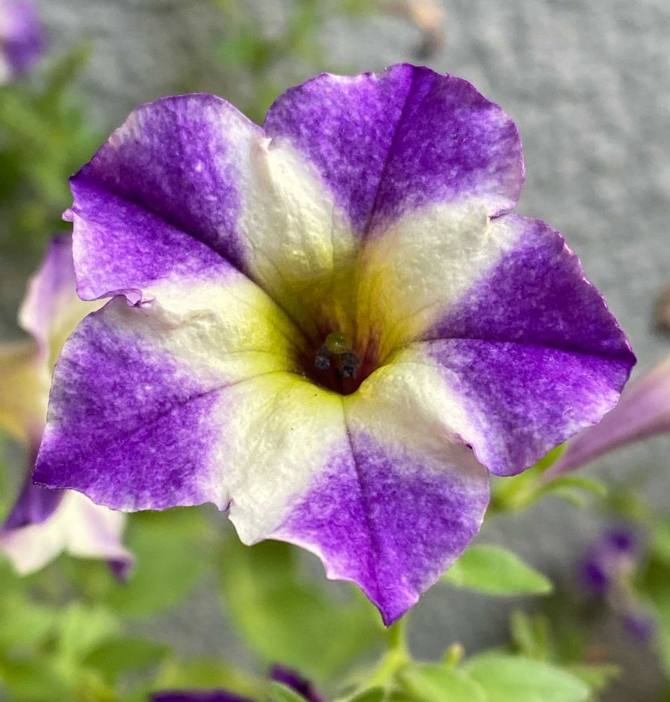 サフィニアも暑さで徒長して伸びてこちらも、花が小さいですね〜