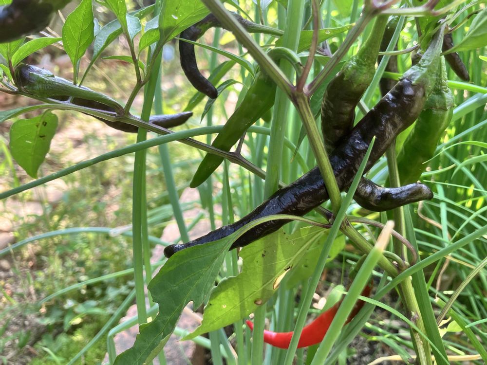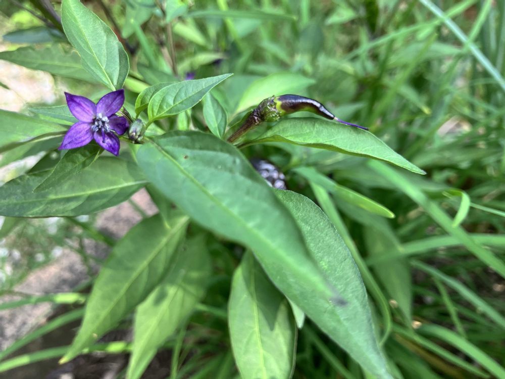紫の花色、いつもの唐辛子とはちがいますよね♡茄子みたい🍆味は辛くなくて、赤く熟すほど甘味が強くなるらしいです✨食べるの楽しみです!