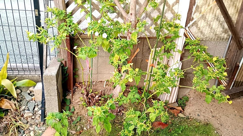 野草のオシロイバナには、関係ない‼️と、去年赤黄色の混色を植えたら、かなり大きく育ち、今年もここの生長が断トツで、一番早く開花もしました🎯