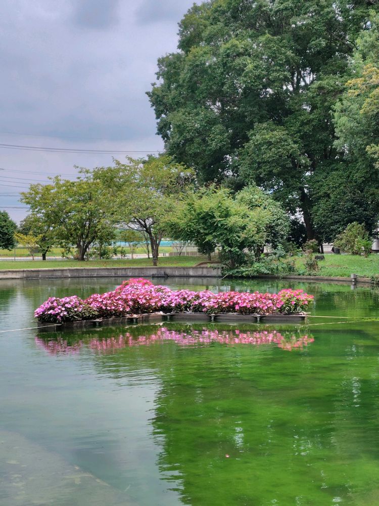 ひょうたん池に浮かぶインパチェンス、池面も華やかですねー✨💍✨🎵