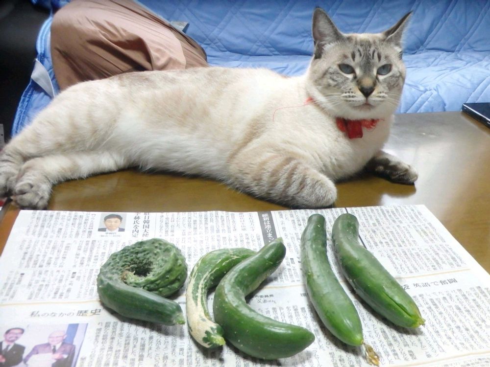猫がキュウリをヘビと見間違えてビックリする説ありますが、ウチの子たちはスーンって感じです。
